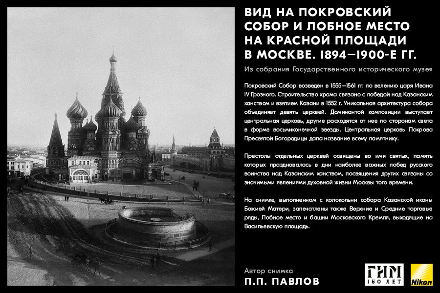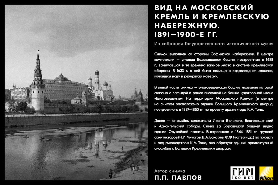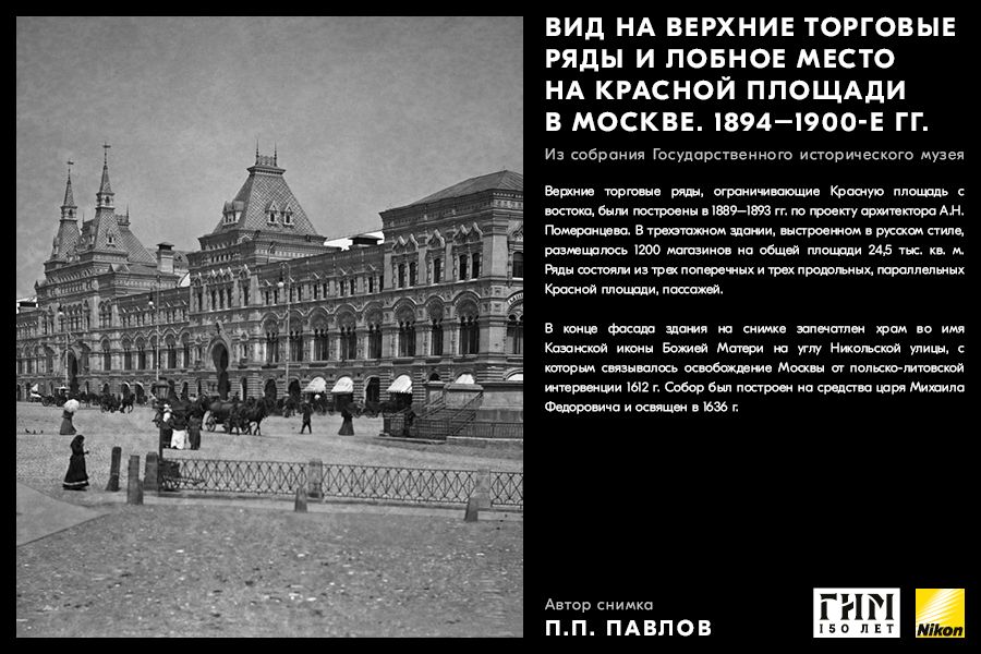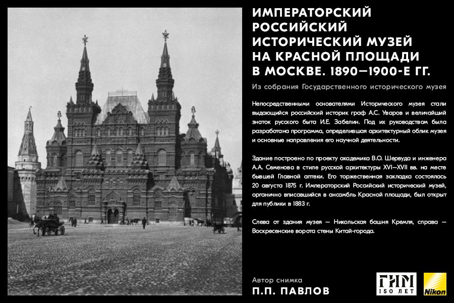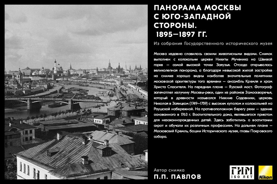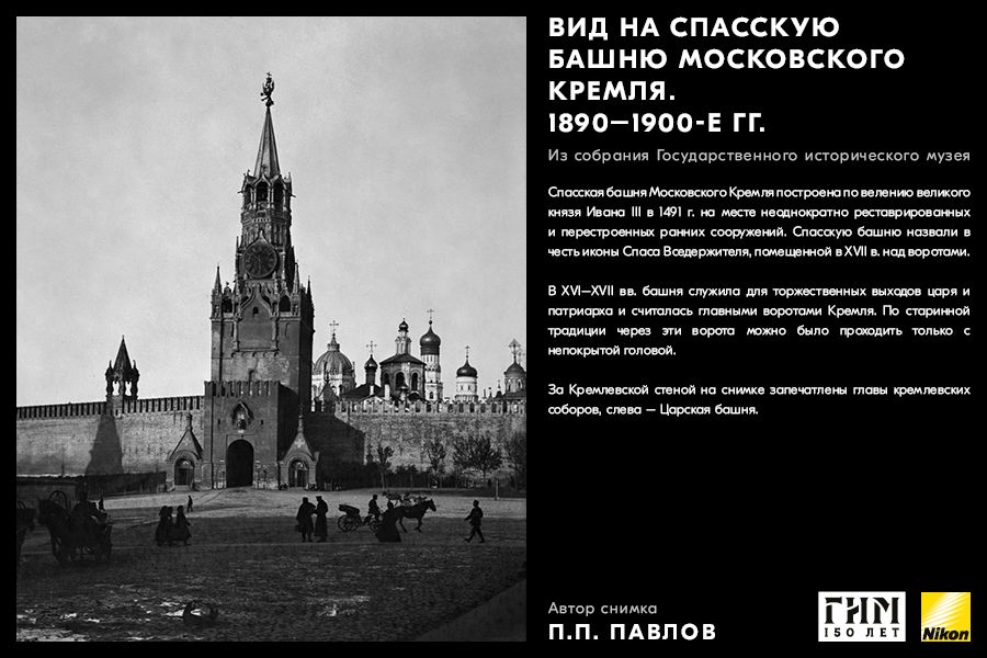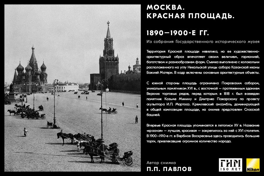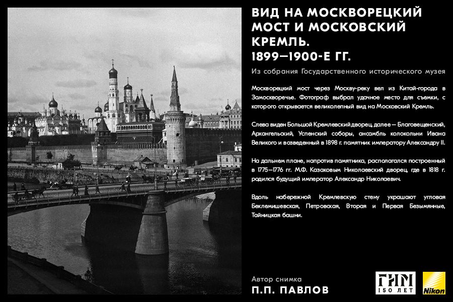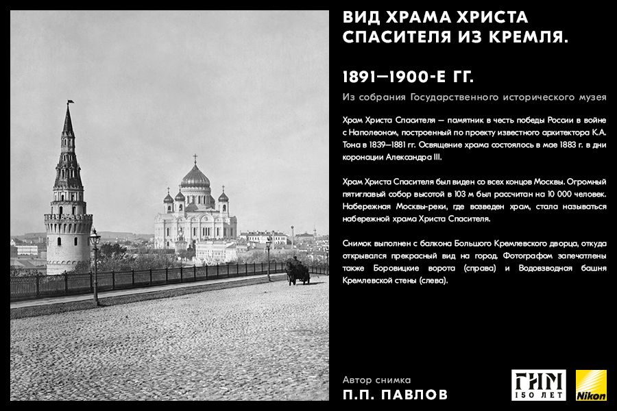 Сделайте фото исторических мест вашего города, вдохновившись советами амбассадора Nikon Максима Мармура, а также выставкой работ профессионального фотографа и владельца фотоателье П.П. Павлова из коллекции Государственного исторического музея. В 1898 г. Петр Павлов начал крупномасштабную съемку достопримечательности Москвы, он сумел создать собственный фотографический образ города конца ХIХ – начала ХХ в. и передать неповторимое обаяние старой Москвы.