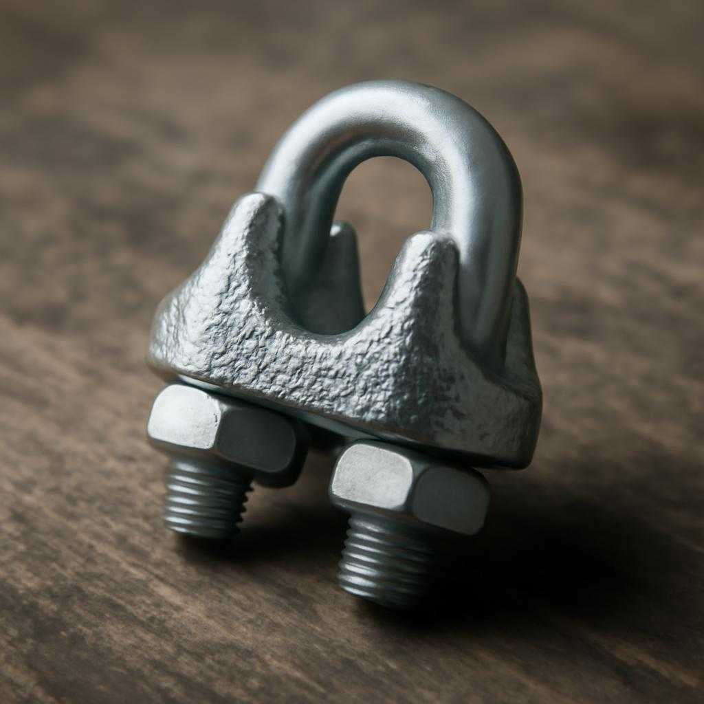 DIN 741 описывает стальной зажим с литым корпусом и U-образным болтом с двумя шестигранными гайками. Конструкция напоминает профиль хобота, отсюда прозвище «Слоник». Для точного подбора служат три ключевых параметра: диаметр троса, марка металла, вид защитного покрытия. Маркировка корпуса указывает габарит, совпадающий с наружным диаметром каната: 3 мм, 5 мм, 6 мм, 8 мм, 10 мм, 12 мм, 14 мм, 16 мм, 18 мм, 20 мм, 22 мм, 26 мм, 30 мм. Допустимая рабочая нагрузка рассчитывается исходя из минимальной разрушающей силы каната, коэффициент запаса 5 и количества скоб. Горячее цинкование защищает от коррозии в атмосфере C3-C4. Для агрессивной химической среды предпочтителен нержавеющий сплав A4-80. Кованый болт повышает прочность резьбы при высоких крутящих моментах.