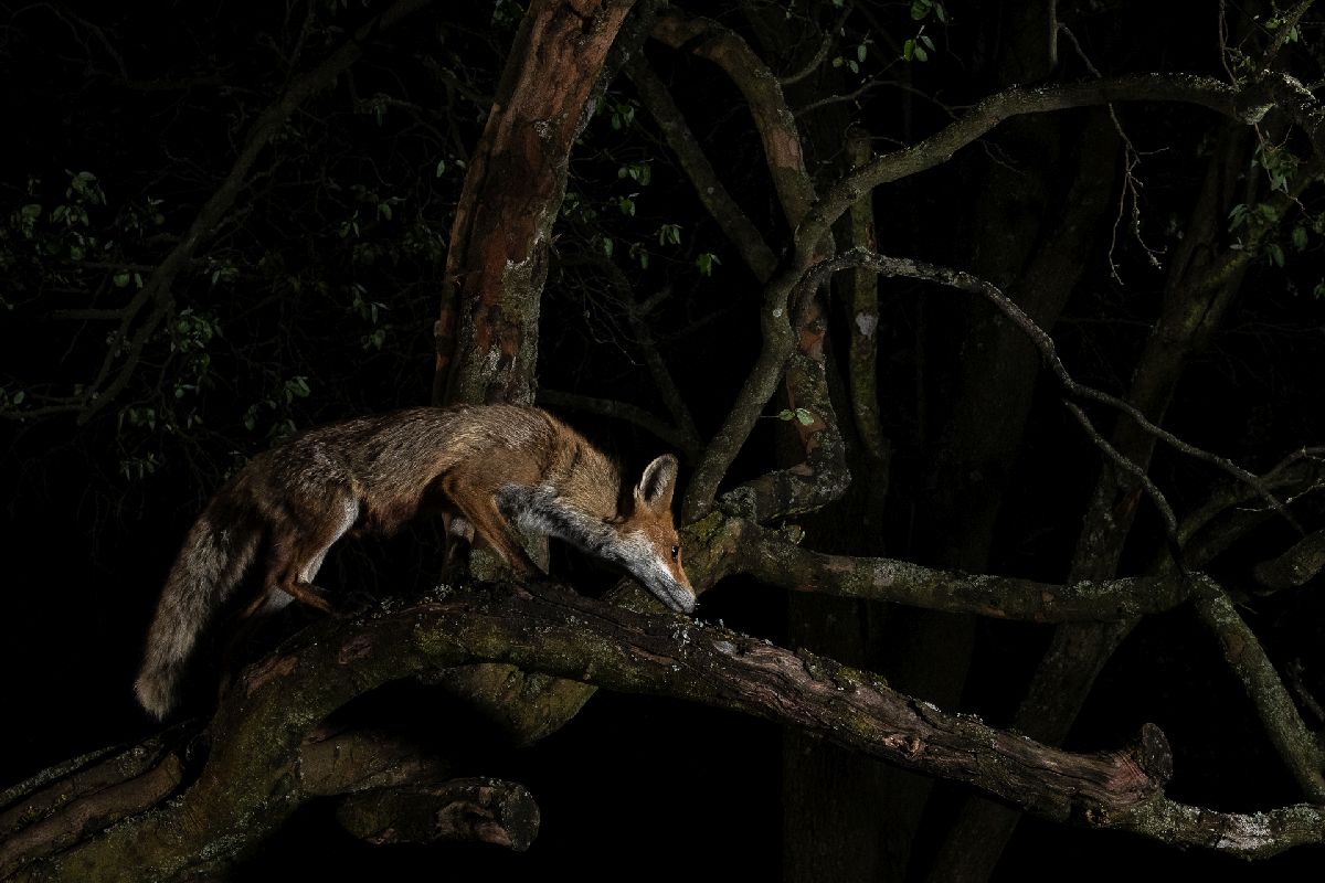 В течение восьми месяцев я почти каждую ночь проводил у окна своего коттеджа посреди леса, где дикие звери живут почти как соседи односельчан. Молодая лисица появляется в деревне после заката, кружит полтора часа и несколько раз появляется во дворе. Я наблюдал за ее движениями и поведением из затемненной комнаты и дистанционно снимал кадры. Я назвал ее Рокси. Я заранее настроил свет, как в студии, и ждал, когда главный герой выйдет на сцену. Она всегда удивляет меня, показывая новую сторону, и мне пришлось решить множество технических, теоретических и физических задач в процессе ее фотографирования. Во время карантина обе стороны были вынуждены приспосабливаться: человек к дебрям леса, животные к среде обитания человека.