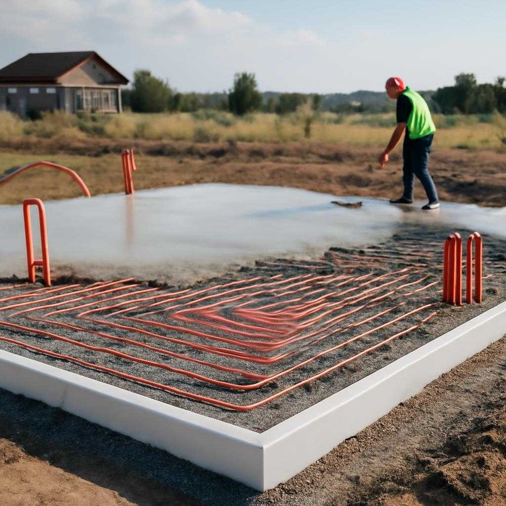 Подготовка участка стартует с геологии, планировки рельефа, отвода поверхностной воды. Далее выполняют песчано-щебёночную подушку с трамбовкой виброплитой. На уплотнённой поверхности монтируют периферийный дренаж, выводят канализационные линии, укладывают теплоизоляцию в два слоя со смещением швов. Плиты ЭППС обрамляют бортиками из того же материала, образуя опалубку. На изоляции раскладывают водяные контуры тёплого пола и трубопроводы холодного ввода в гофре. Сетчатое армирование размещают на фиксаторах, выдерживая защитный слой. Бетон М300 поступает прямо из автобетоносмесителя, разравнивание правило и глубинный вибратор убирают воздушные включения. Через сутки поверхность затиркой доводят до полимерного молочка, через семь дней приступают к возведению коробки.